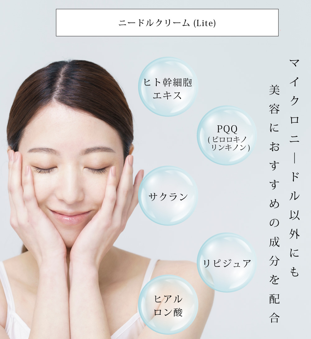 【ニードルクリーム(Lite) 内容量:45g】全成分:水,ホホバ種子油,BG,セテアリルアルコール,グリセリン,ヒト幹細胞順化培養液,ピロロキノリンキノン,スイゼンジノリ多糖体,ヒアルロン酸Na,ベタイン,加水分解カイメン,ローズマリー葉エキス,アルニカ花エキス,セイヨウオトギリソウ花/葉/茎エキス,セイヨウキズタ葉/茎エキス,セイヨウトチノキ種子エキス,ハマメリス葉エキス,ブドウ葉エキス,ヒマシ油,ヒアルロン酸ヒドロキシプロピルトリモニウム,アラントイン,レウコノストック/ダイコン根発酵液,ポリクオタニウム-51,酢酸トコフェロール,ポリソルベート60,ステアリン酸,1,2−ヘキサンジオール,フェノキシエタノール,ホウケイ酸(Ca/Na),酸化銀