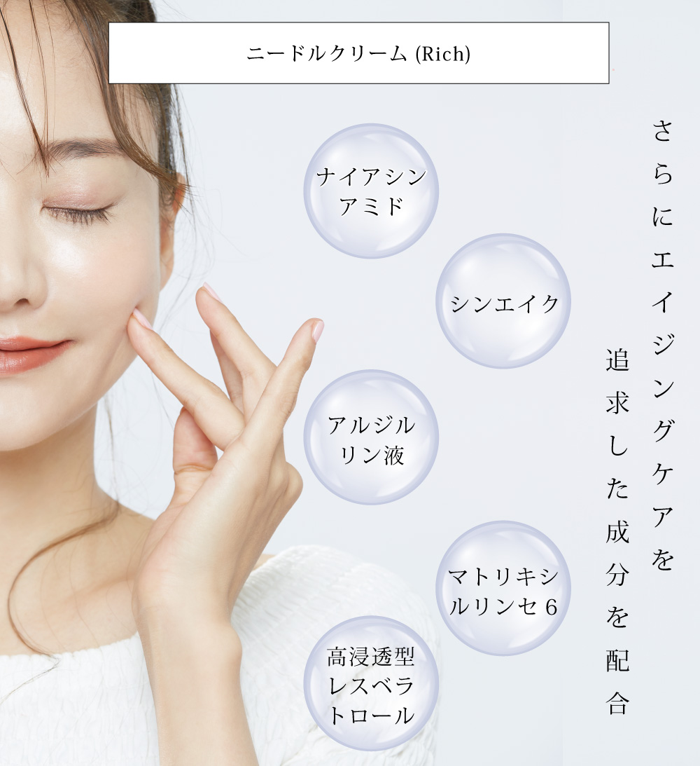 【ニードルクリーム(Rich) 内容量:45g】全成分:水,ホホバ種子油,BG,セテアリルアルコール,グリセリン,加水分解カイメン,ヒト幹細胞順化培養液,ナイアシンアミド,ピロロキノリンキノン,スイゼンジノリ多糖体,